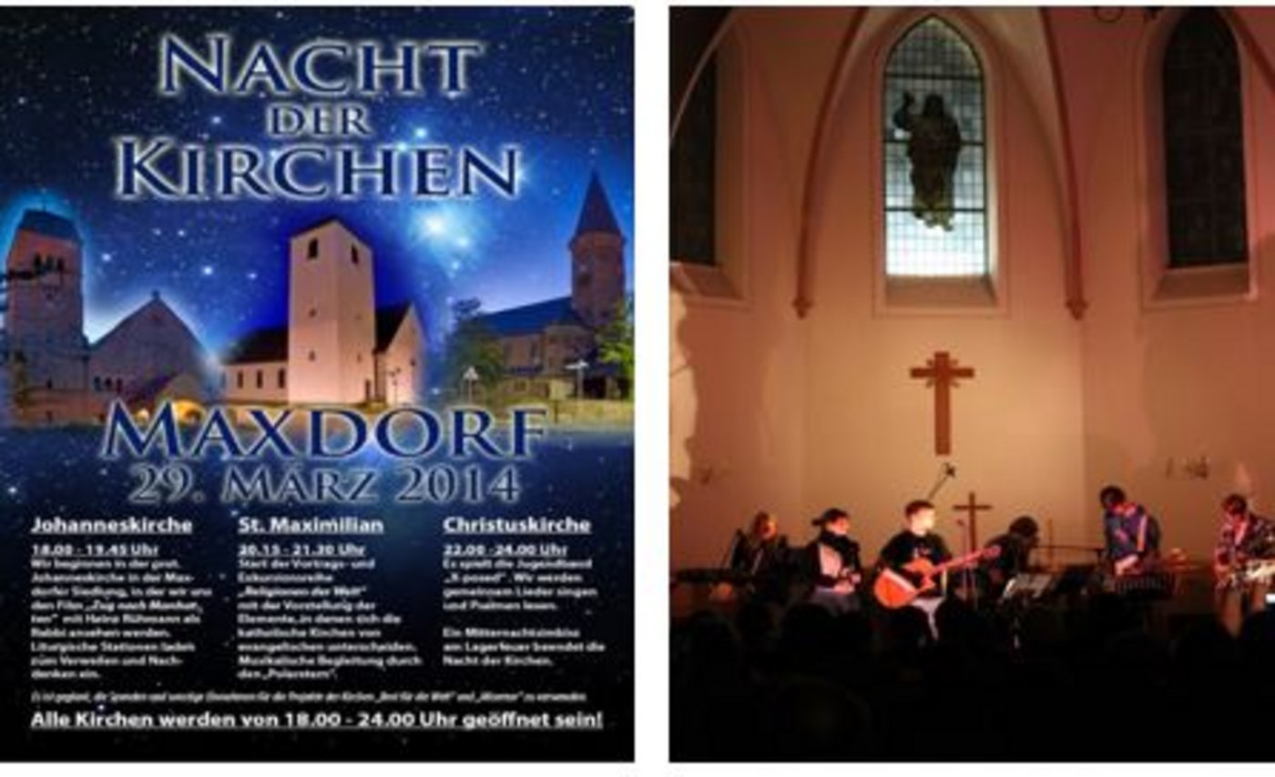 Ökumene wird in Maxdorf seit vielen Jahren durch die drei örtlichen Kirchengemeinden aktiv gelebt. Zahlreiche Podiumsdiskussionen und regelmäßige "Feste der Kirchen" wurden schon länger durchgeführt. Aus dem Gedanken heraus neue Wege zu gehen, beschlossen wir eine "Lange Nacht der Kirchen" zu veranstalten. Inzwischen haben wir die dritte Lange Nacht mit großer Resonanz und zahlreichen Besuchern aus unseren drei Gemeinden feiern können.